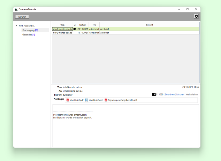 Über den Menüpunkt "gematik / eDienste" -- Connect-Zentrale (KIM) gelangen Sie in Ihr elektronische Postfach.